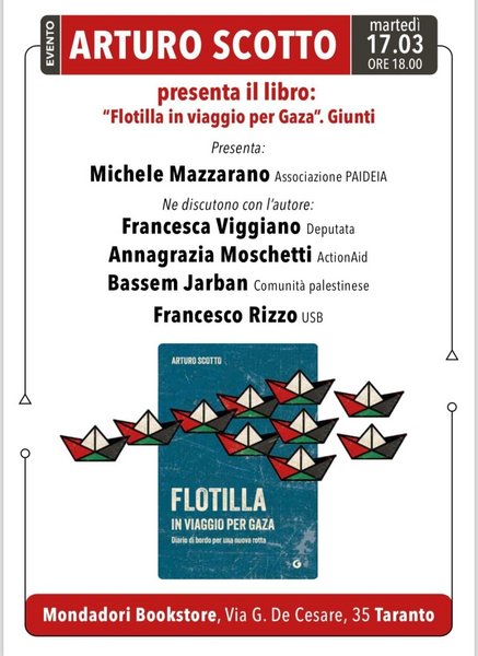 Arturo Scotto presenta a Taranto il suo libro:“Flotilla, un viaggio per Gaza” il giorno martedì 17 marzo ore 18.00 presso Mondadori Bookstore, via De Cesare, 35, Taranto.
