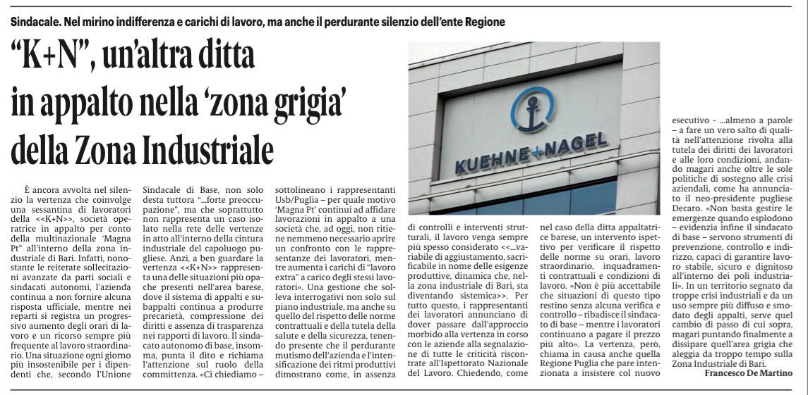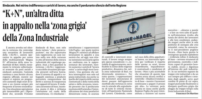 La situazione all’interno degli appalti Kuehne+Nagel nella zona industriale di Bari è ormai sotto gli occhi di tutti: carichi di lavoro insostenibili, straordinari continui, poca trasparenza e diritti dei lavoratori sempre più messi in discussione.